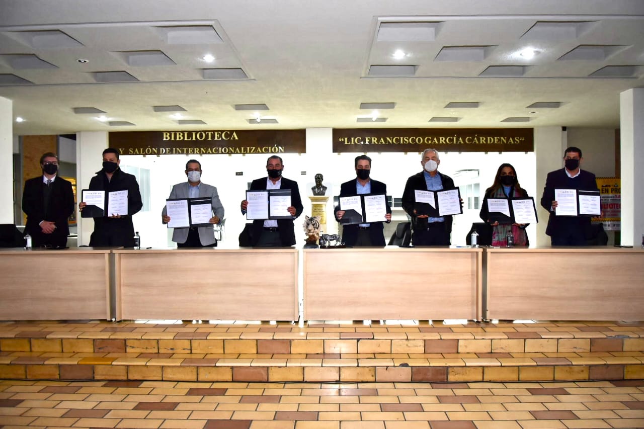 La Secretaría firmó el convenio junto a los titulares dela Comisión de Vivienda y de la CERTTURC, además del Dr. Raúl Alfonso Villarreal flores, Coordinador de Posgrado en Investigación; Ana Marcela Sánchez Rodríguez, Secretaria Técnica; Jesús Alberto Sánchez Rodríguez, presidente de la Sociedad de Alumnos, y Jesús Octavio Pimentel Martínez, Coordinador General de Vinculación e Innovación Productiva de la universidad.