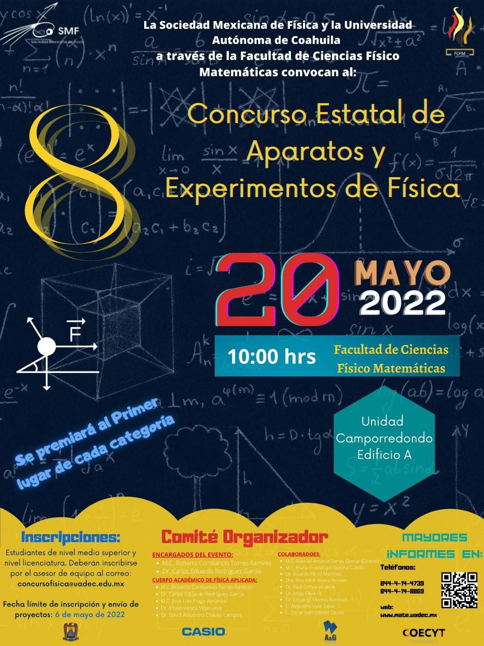 SALTILLO, Coahuila. 22 de marzo de 2022.- La Universidad Autónoma de Coahuila a través de la Facultad de Ciencias Físico Matemáticas y la Sociedad Mexicana de Física, invitan a estudiantes de bachillerato y licenciatura a participar en el VIII Concurso Estatal de Aparatos y Experimentos de Física, que se llevará a cabo el 20 de mayo de 2022 a las 10:00 horas en las instalaciones de la Facultad de Ciencias Físico Matemáticas en Unidad Camporredondo Edificio “A” y de manera virtual por la plataforma Microsoft Teams.