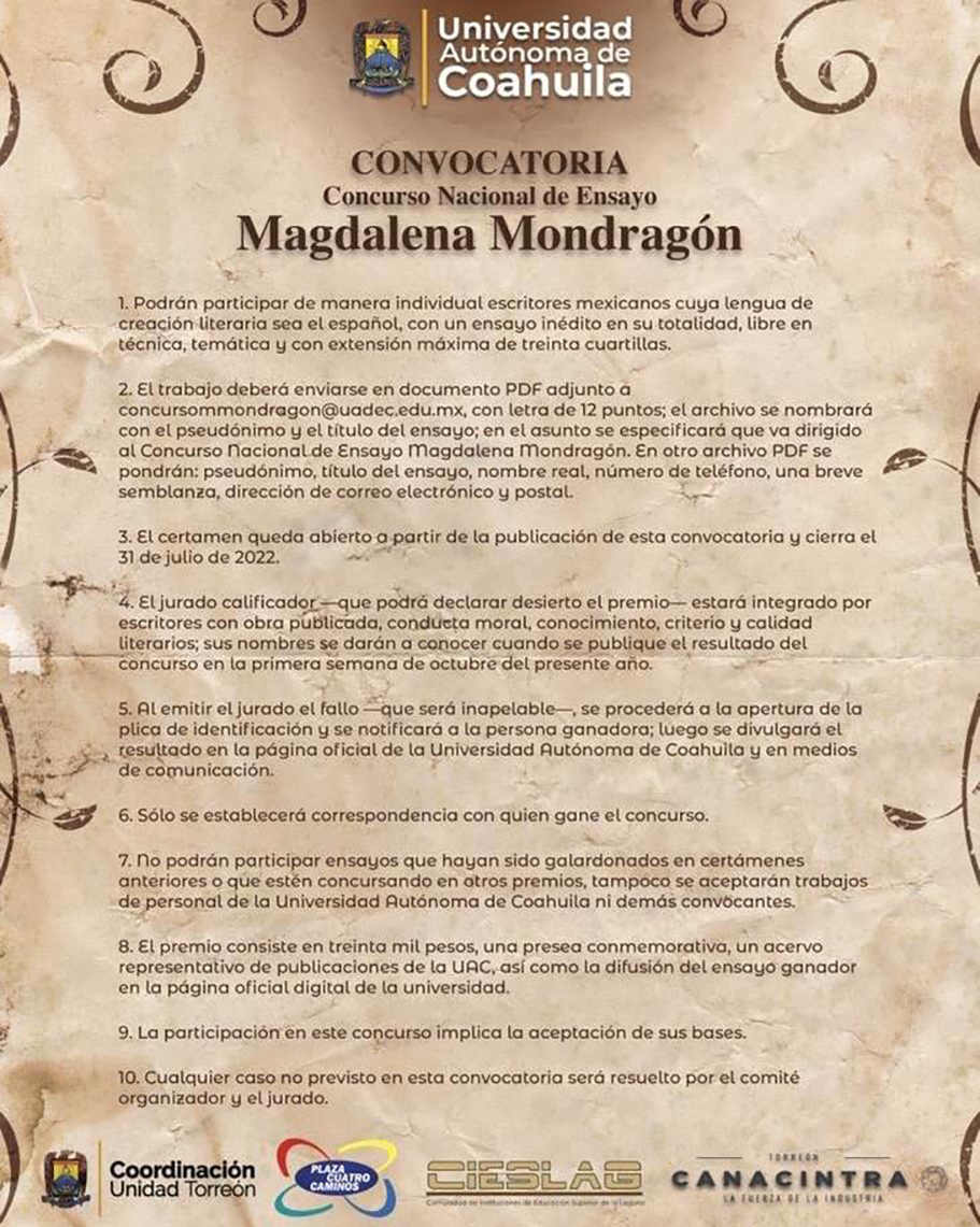 SALTILLO, Coahuila. 6 de abril de 2022. La Universidad Autónoma de Coahuila a través de la Coordinación de Unidad Torreón en conjunto con Plaza Cuatro Caminos, CIESLAG y Canacintra Torreón, convocan al Concurso Nacional de Ensayo “Magdalena Mondragón”, en el cual podrán participar de manera individual escritores mexicanos cuya lengua de creación literaria sea el español, con un ensayo inédito en su totalidad, libre en técnica, temática y con extensión máxima de treinta cuartillas.