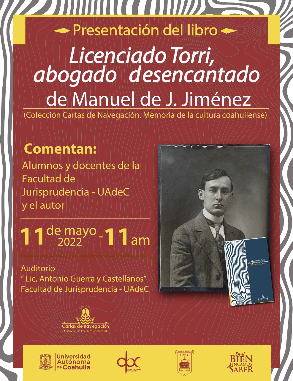 SALTILLO, Coahuila; 11 de mayo de 2022. En la sala de proyecciones de la Facultad de Jurisprudencia de la Universidad Autónoma de Coahuila, se presentó el libro “Licenciado Torri Abogado Desencantado”, de Manuel de J. Jiménez, edición que forma parte de la Colección “Cartas de Navegación. Memorias de la Cultura coahuilense”.