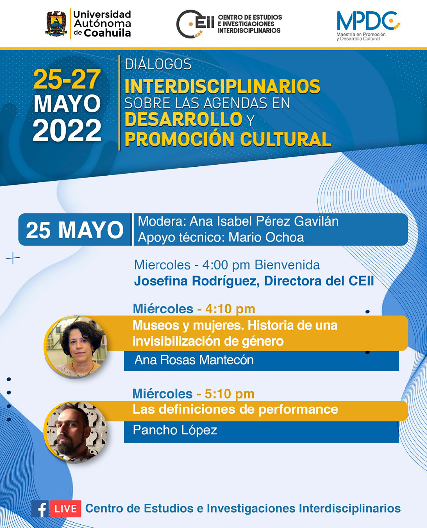SALTILLO, Coahuila. 20 de mayo de 2022.- El Centro de Estudios e Investigaciones Interdisciplinarios (CEII) de la Universidad Autónoma de Coahuila, a través de su Maestría en promoción y Desarrollo Cultural, invita a la comunidad universitaria y público en general al evento “Diálogos Interdisciplinarios sobre la Agenda en Desarrollo y Promoción Cultural”, que se llevará a cabo del 25 al 27 de mayo de 2022.