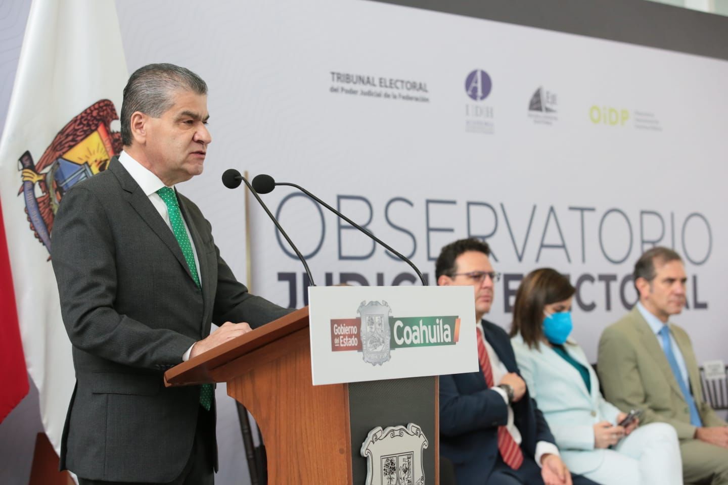 El gobernador Miguel Ángel Riquelme Solís, en este marco, refrendó el compromiso total Coahuila de respetar las decisiones de las autoridades, que ponen fin a los conflictos electorales además de fortalecer su función principal: garantizar la voluntad soberana del pueblo, que le otorga legitimidad al Gobierno representativo.