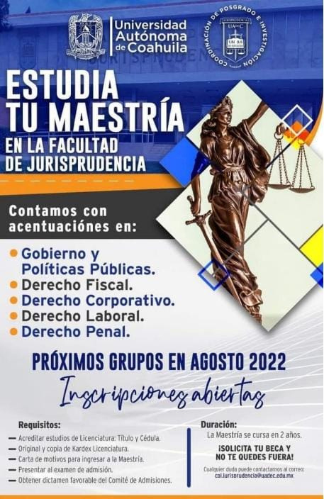 SALTILLO, Coahuila. 1 de agosto de 2022.- La Facultad de Jurisprudencia de la Universidad Autónoma de Coahuila, convoca a egresados de licenciaturas en áreas de ciencias sociales y administrativas, así como a funcionarios públicos a cursar la Maestría en Derecho con Acentuación en Derecho Corporativo, en Derecho Fiscal, en Gobierno y Políticas Públicas, en Derecho Penal y en Derecho Laboral.