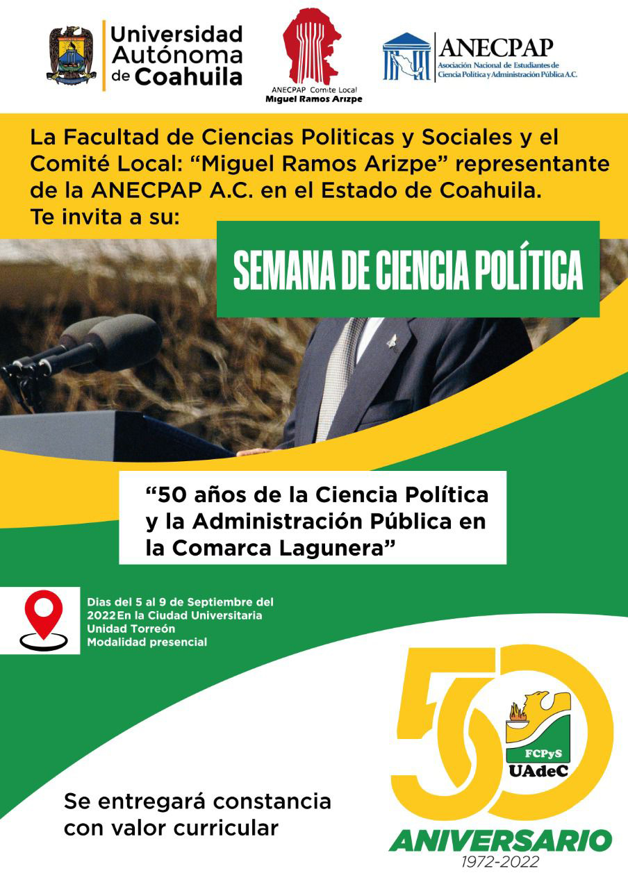 TORREÓN, Coahuila. 3 de agosto de 2022.- Como parte de los festejos por su 50 aniversario, la Facultad de Ciencias Políticas y Sociales Unidad Torreón de la Universidad Autónoma de Coahuila, invita a la “Semana Política: 50 años de la Ciencia Política y la Administración Pública en la Comarca Lagunera” que se llevará a cabo del 5 al 9 de septiembre de 2022.