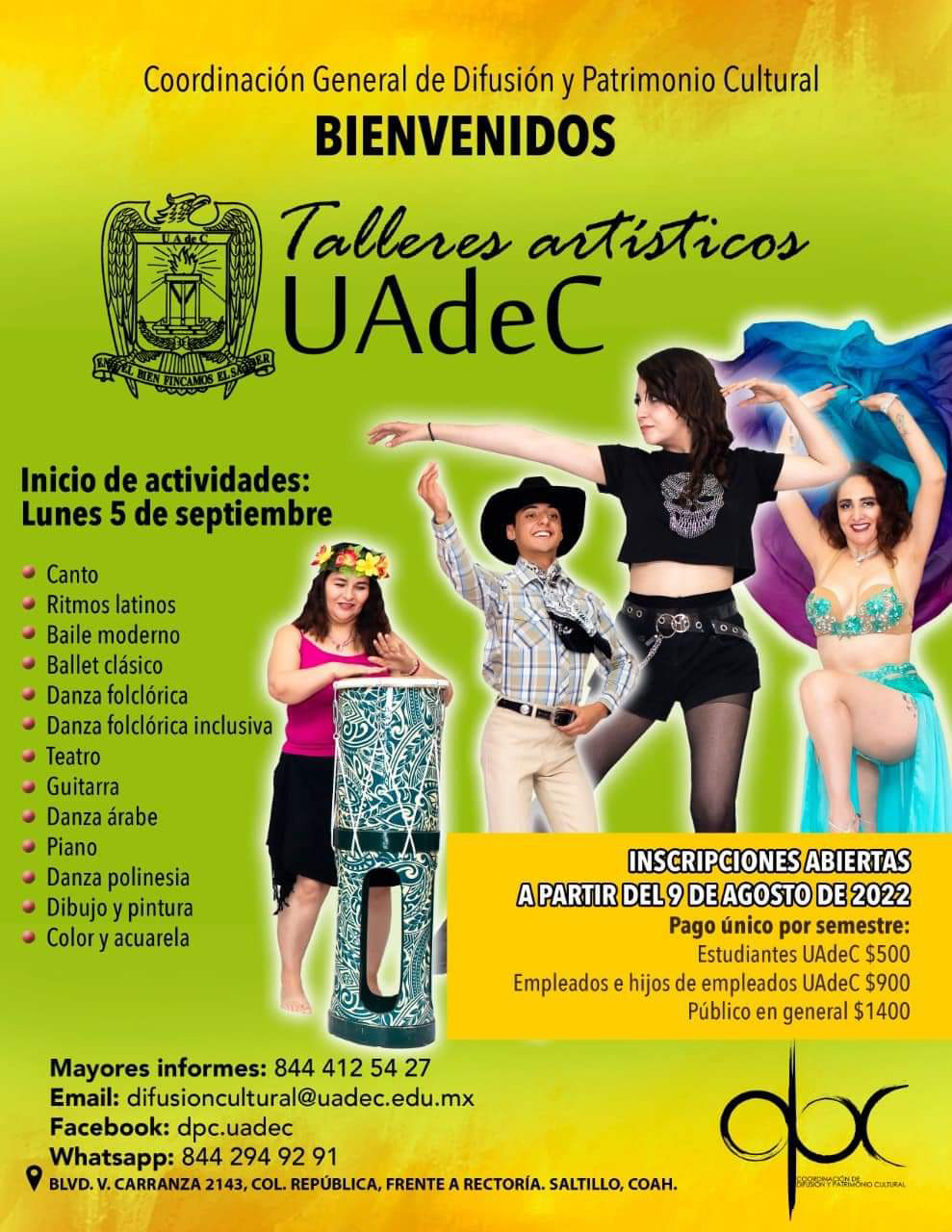 Las inscripciones deben realizarse directamente en las instalaciones de Grupos y Talleres de la UAdeC, ubicadas en Bulevar Venustiano Carranza #2143, Col. República, frente al edificio de Rectoría en Saltillo, Coahuila, en horario de 9:00 a 14:00 horas con Claudia Moreno y de 15:00 a 20:00 horas con Ramón Chapa; para más información, comunicarse al WhatsApp (844) 294 92 91, llamar al teléfono (844) 412 54 27 o por medio del correo electrónico Esta dirección de correo electrónico está siendo protegida contra los robots de spam. Necesita tener JavaScript habilitado para poder verlo. y en la página de Facebook Dpc Uadec.