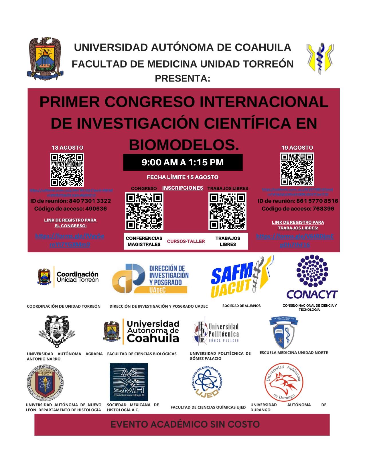 TORREÓN, Coahuila. 12 de agosto de 2022.- La Facultad de Medicina Unidad Torreón de la Universidad Autónoma de Coahuila invita al Primer Congreso Internacional de Investigación Científica en Biomodelos, el cual se llevará a cabo el 18 y 19 de agosto de 2022 de 9:00 a 13:15 horas de manera virtual a través de la plataforma Zoom y de manera presencial en el auditorio del plantel.