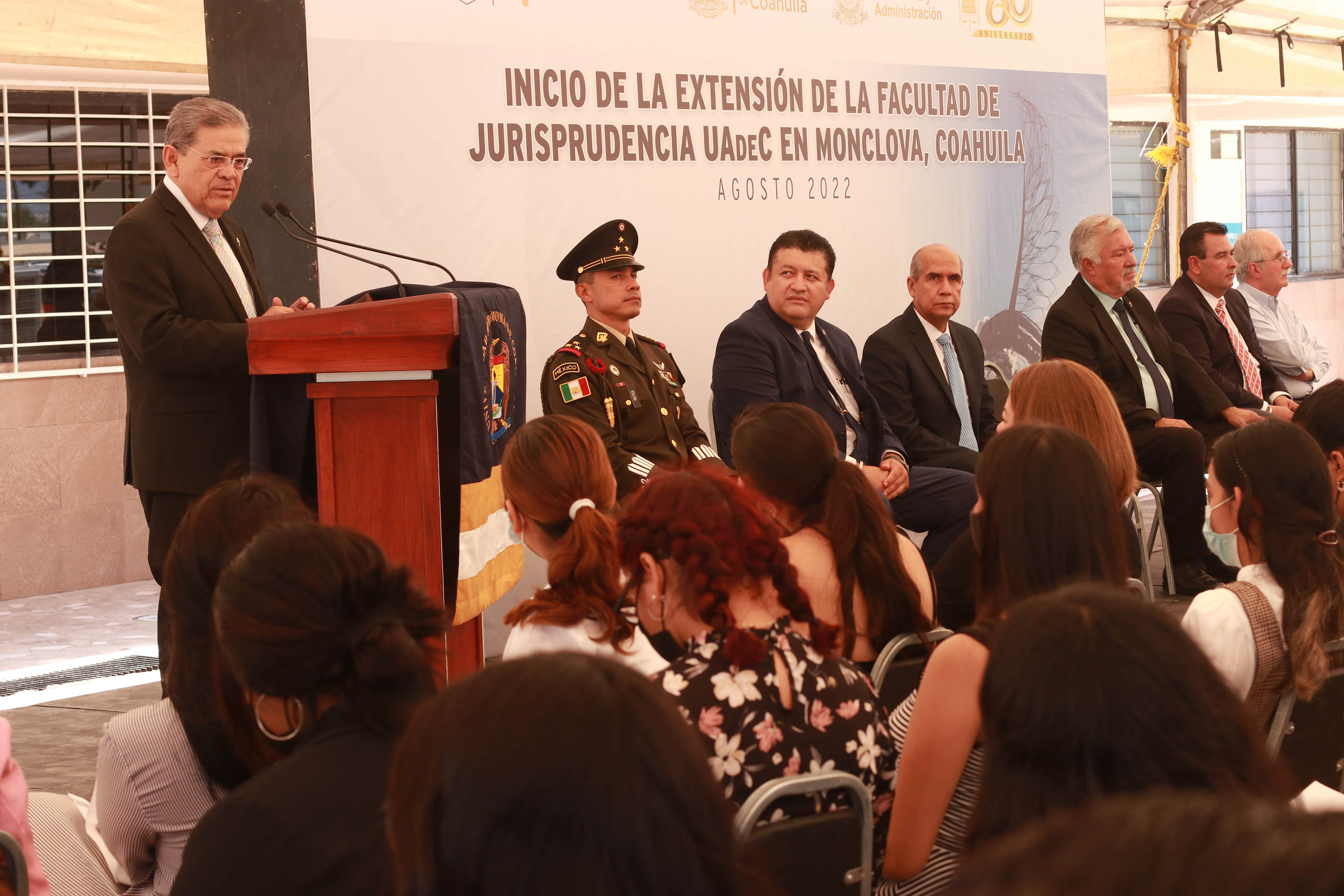 MONCLOVA, Coahuila. 22 de agosto de 2022.- Este lunes la Universidad Autónoma de Coahuila llevó a cabo el inicio de la extensión de la Facultad de Jurisprudencia en Monclova, la cual tiene como sede la Facultad de Contaduría y Administración, esto con el objetivo de ofrecer el programa de la Licenciatura en Derecho, cuya primera generación está conformada por 53 estudiantes.