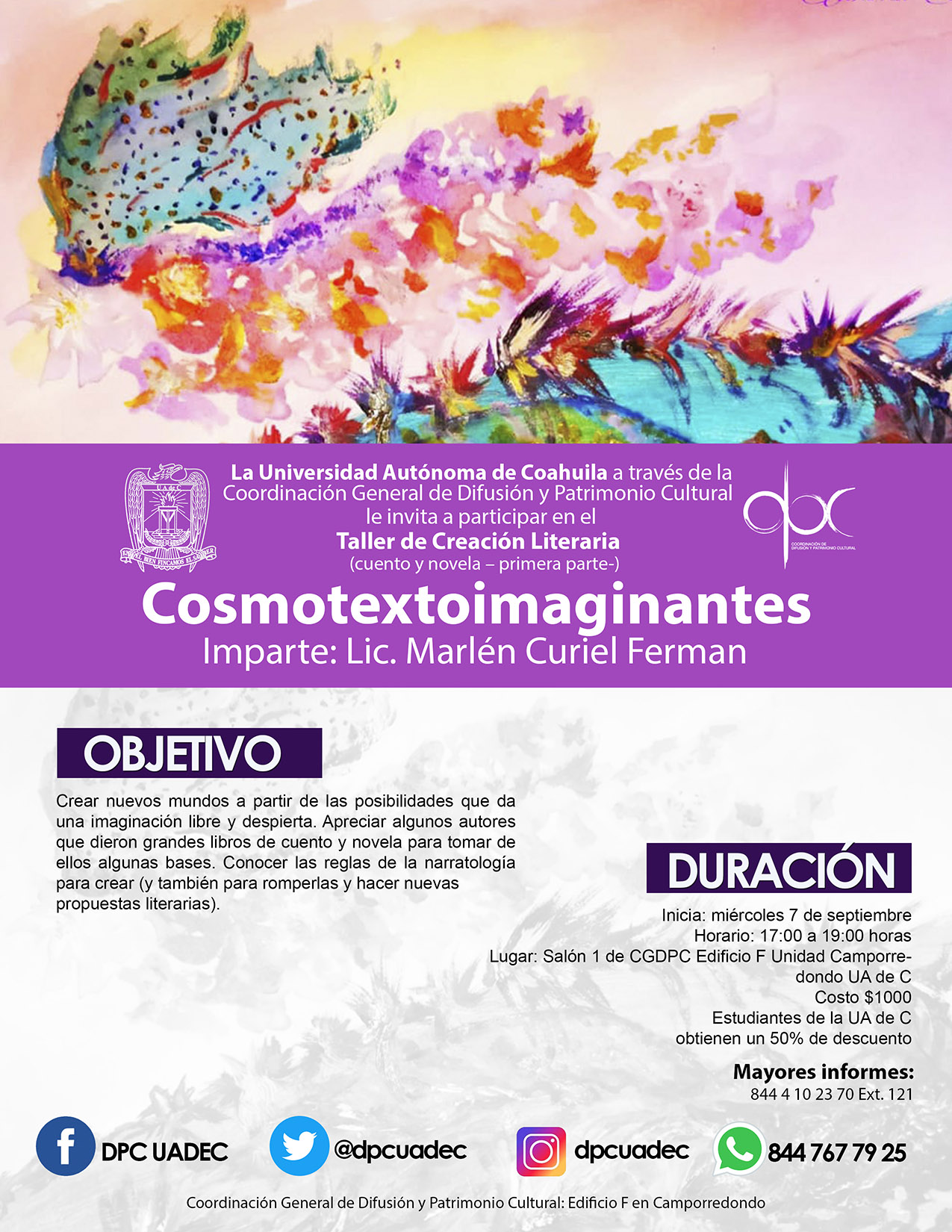 Mientras que, el 7 septiembre comenzarán los talleres de Creación Literaria (cuento y novela-primera parte) Cosmotextoimaginantes, con el que se busca crear nuevos mundos a partir de las posibilidades que da una imaginación libre y despierta, apreciar algunos autores que dieron grandes libros de cuento y novela para tomar de ellos algunas bases y conocer las reglas de la narratología.