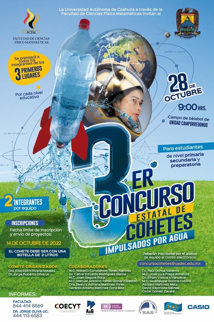 SALTILLO, Coahuila. 13 de octubre de 2022. La Universidad Autónoma de Coahuila a través de la Facultad de Ciencias Físico Matemáticas invitan a participar en el Tercer Concurso Estatal de Cohetes Propulsados por Agua; la fecha de registro de aspirantes vence este viernes 14 de octubre.