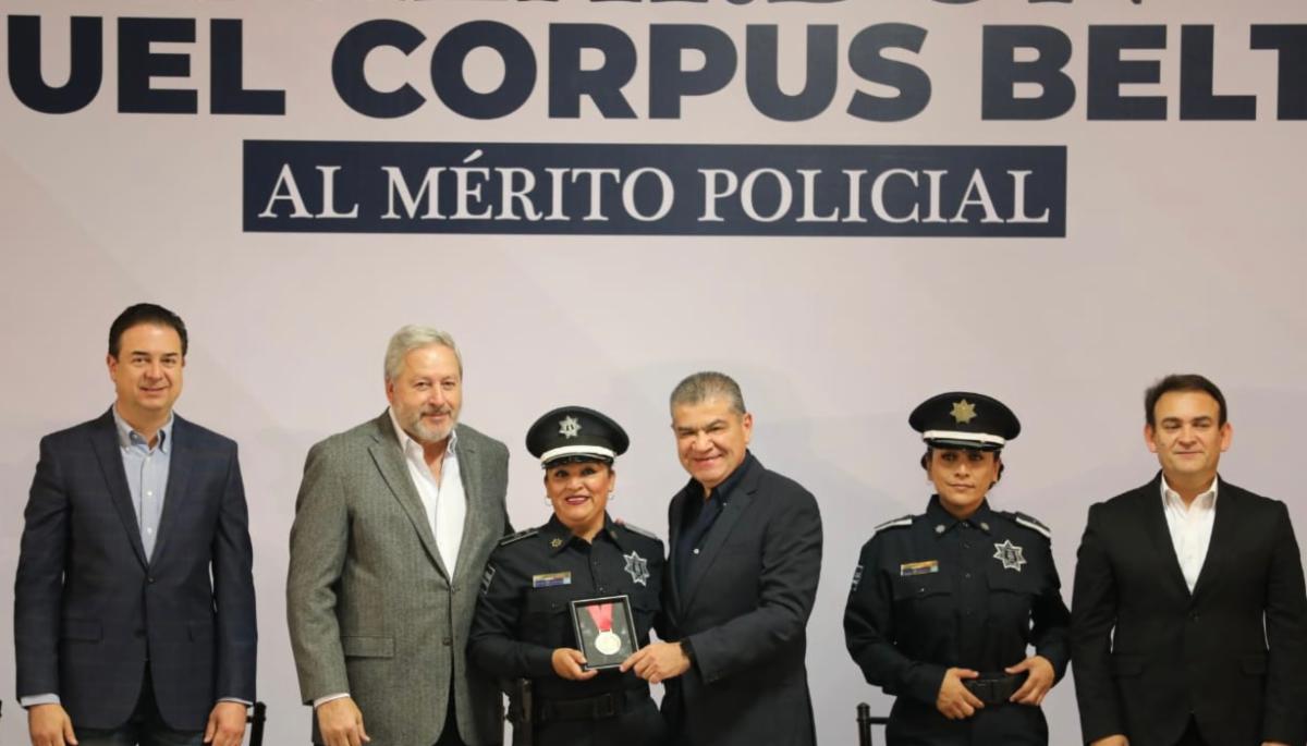 El alcalde José María Fraustro Siller y el gobernador Miguel Ángel Riquelme Solís entregaron el Galardón Manuel Corpus Beltrán al Mérito Policial en su edición 2023, esto como parte de las actividades del Día del Policía Saltillense.