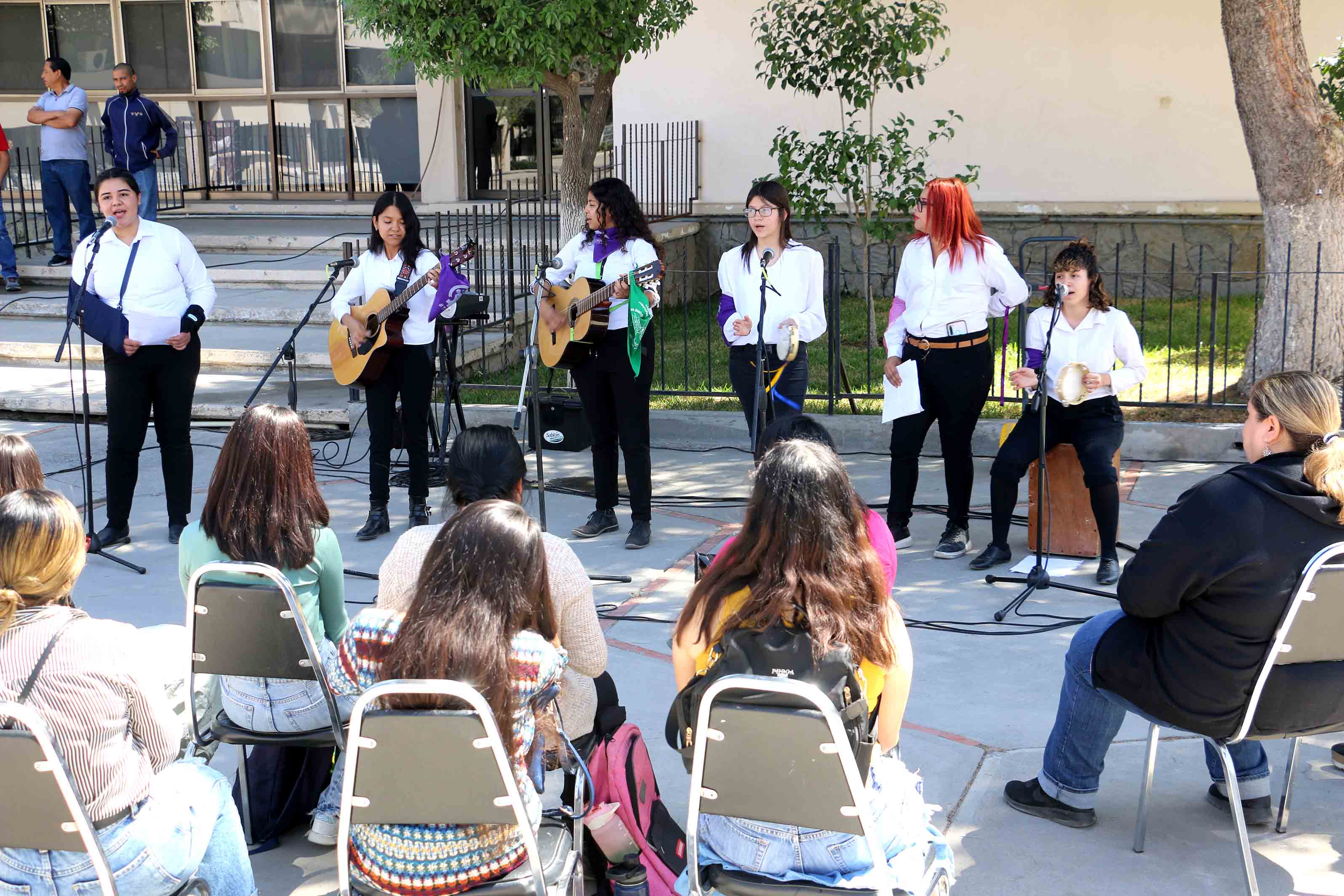 Posteriormente, con el objetivo de visibilizar los grupos representativos de mujeres que existe en la Universidad, se realizó la presentación artística de la Tuna Femenil Universitaria, que interpretó diversas piezas musicales, escritas por mujeres como “Manantial de caricias”, “Hoy”,” Ella”, “Canción sin miedo”, entre otras.