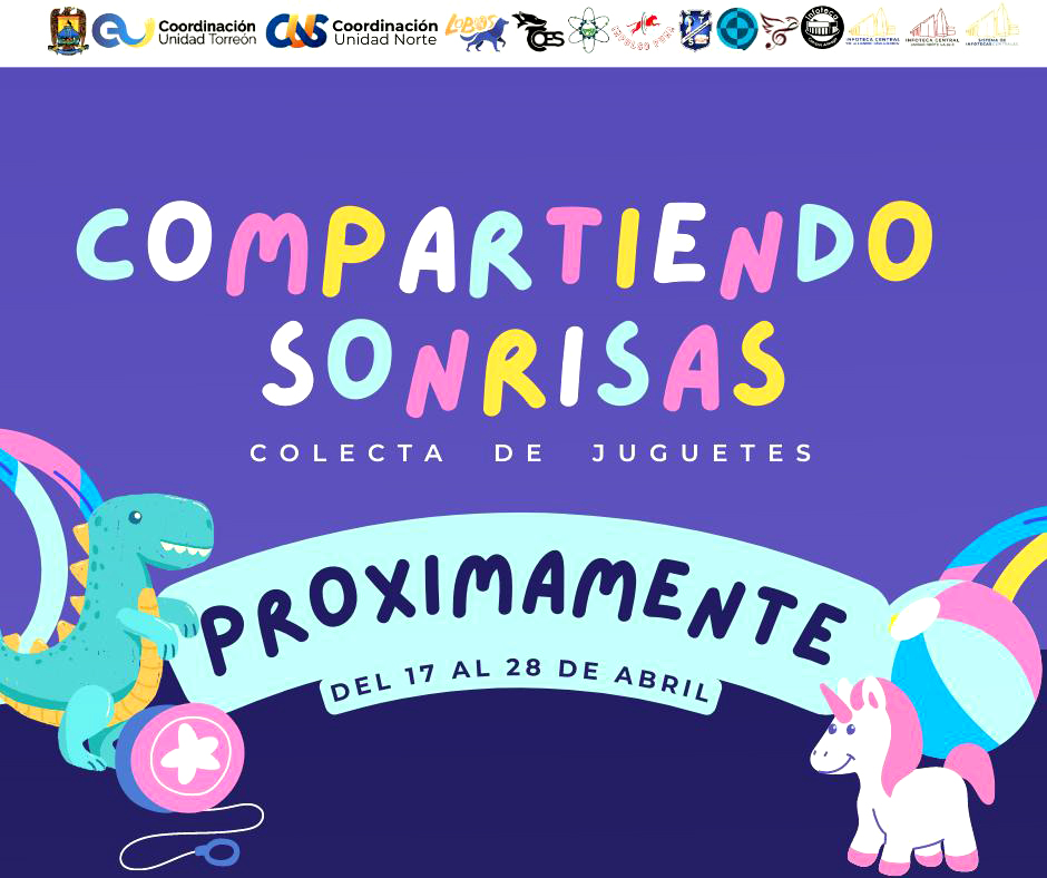 SALTILLO, Coahuila. 17 de abril de 2023. En el marco de la celebración por el Día del Niño y la Niña, la Universidad Autónoma de Coahuila a través de la Coordinación de Extensión Universitaria, convoca a la comunidad universitaria y público en general a participar en la colecta de juguetes “Compartiendo Sonrisas” que se realizará de manera simultánea en las tres unidades Saltillo, Torreón y Norte del 17 al 28 de abril.