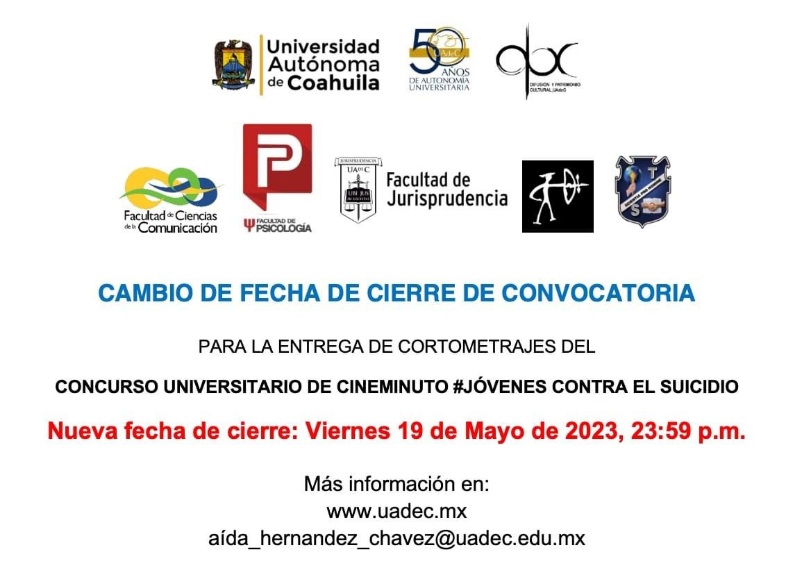 SALTILLO, Coahuila. 12 de mayo de 2023. La Universidad Autónoma de Coahuila, a través de la Coordinación General de Difusión y Patrimonio Cultural, las Facultades de Ciencias de la Comunicación, Psicología, Trabajo Social, Ciencias Sociales y Jurisprudencia, en colaboración interinstitucional con la Secretaría de Salud, la Fiscalía General, la Secretaria de Educación y la Secretaría de Cultura del Estado, así como el Ayuntamiento de Saltillo, informan a coahuilenses de 17 a 30 años interesados en participar en el Concurso Estatal de Cortometraje #JóvenesContraElSuicidio, que la fecha de recepción de videos se extiende al 19 de mayo de 2023 a las 23:59 horas.
