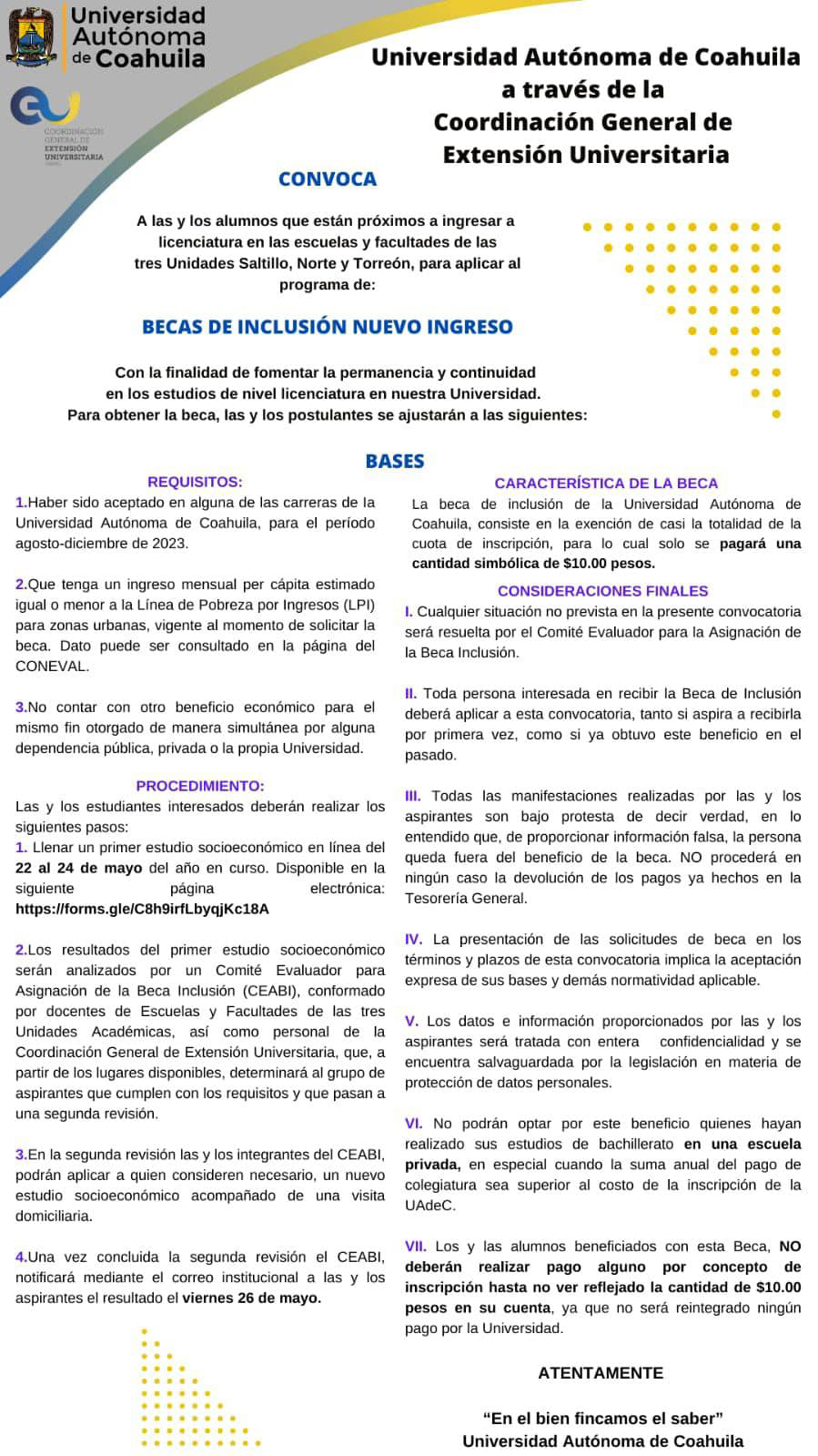 SALTILLO, Coahuila. 22 de mayo de 2023. Con la finalidad de fomentar la permanencia y continuidad en los estudios de nivel licenciatura, la Universidad Autónoma de Coahuila a través de la Coordinación General de Extensión Universitaria, convoca a las y los alumnos que están próximos a ingresar a licenciatura en las Escuelas y Facultades de las tres Unidades Saltillo, Torreón y Norte, a aplicar en el Programa de Becas de Inclusión Nuevo Ingreso.
