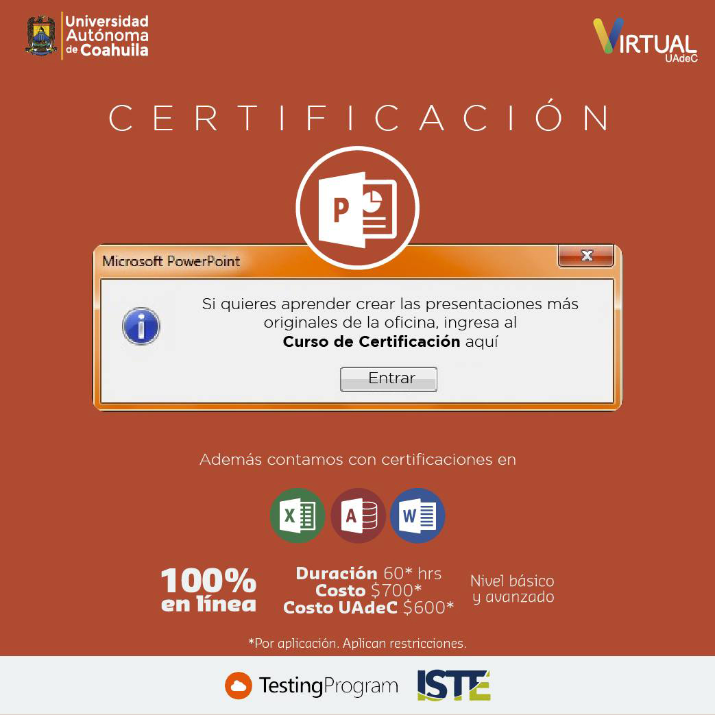 SALTILLO, Coahuila. 9 de junio de 2023. La Coordinación General de Educación a Distancia de la Universidad Autónoma de Coahuila, invita a certificarse internacionalmente en Microsoft Office a través de la plataforma Testing Program, el costo del curso por aplicación para el público en general es de $700 pesos y para trabajadores y estudiantes de la institución es de $600 pesos.