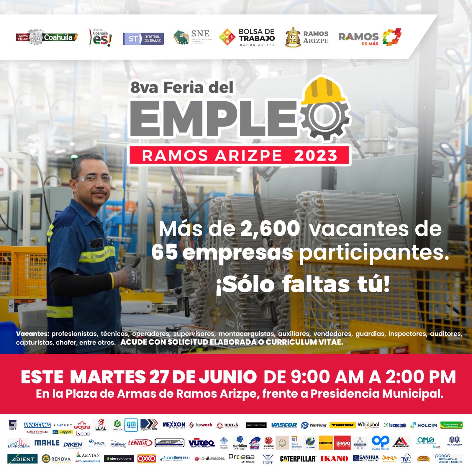 El municipio de Ramos Arizpe anunció la Feria del Empleo "Solo faltas tú", a realizar el próximo martes 27 de junio, con una oferta de más de 2 mil 600 vacantes.