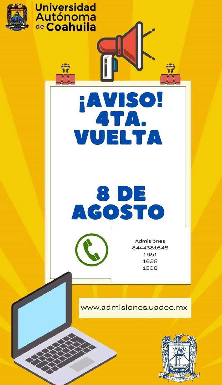 Los resultados de la Cuarta Vuelta se darán a conocer el 10 de agosto, el pago de la inscripción se hará del 10 al 11 de agosto y la entrega de documentos el día 14 de este mismo mes; para más información comunícate al Departamento de Admisiones a los teléfonos (844) 438 1651, (844) 438 1648 y (844) 438 1508.