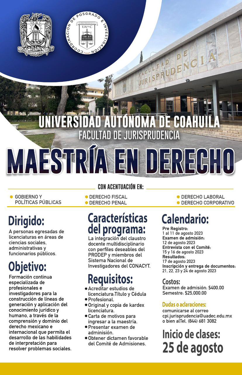 SALTILLO, Coahuila. 7 de agosto de 2023. La Facultad de Jurisprudencia de la Universidad Autónoma de Coahuila, convoca a egresados de licenciaturas de las áreas de ciencias sociales y administrativas, así como a funcionarios públicos a cursar la Maestría en Derecho con Acentuación en Derecho Corporativo, en Derecho Fiscal, en Gobierno y Políticas Públicas, en Derecho Penal y en Derecho Laboral.