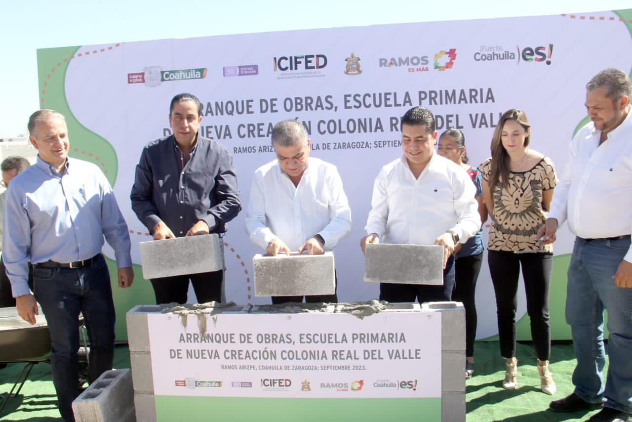 Riquelme Solís, junto al Alcalde de Ramos Arizpe, José María Morales Padilla, y del Secretario de Educación estatal, Francisco Saracho Navarro, colocó la primera piedra del edificio escolar, que contará con cuatro aulas, servicios sanitarios, obra exterior barda perimetral además de equipamiento y mobiliario.