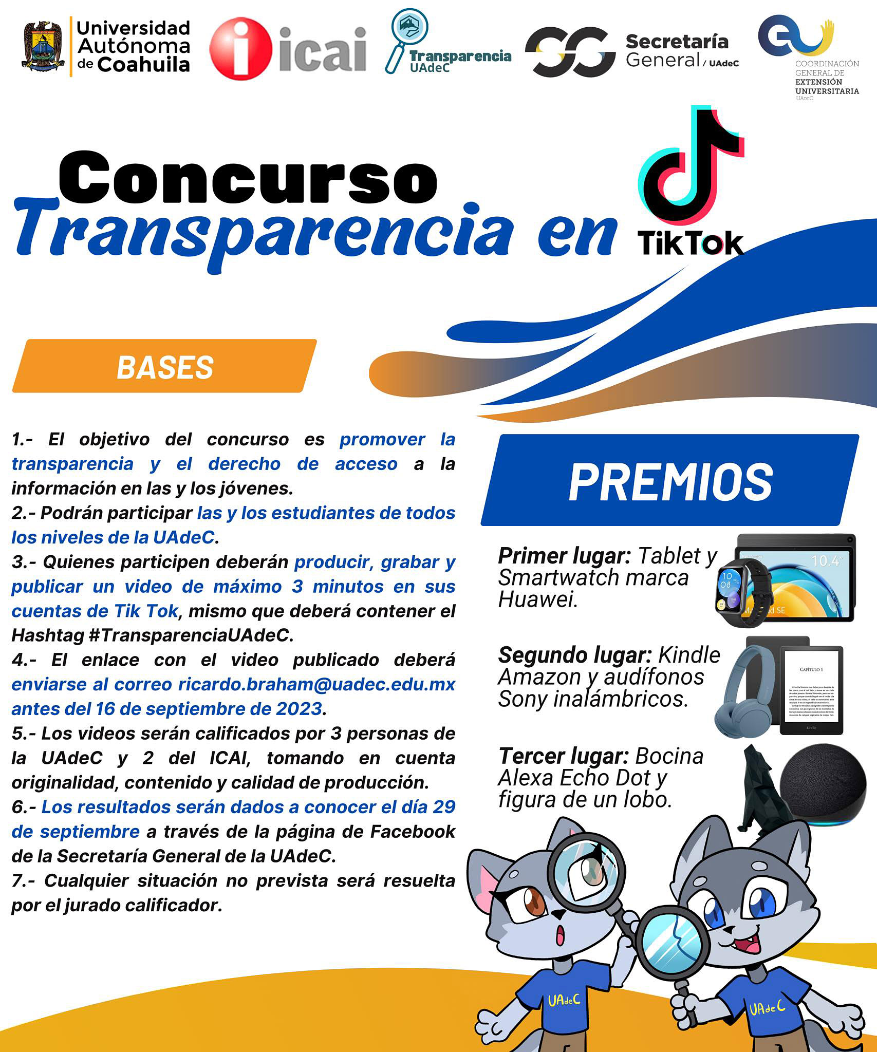 SALTILLO, Coahuila. 6 de agosto de 2023. Con el objetivo de promover el ejercicio del Derecho al acceso a la Información pública y la Transparencia entre los jóvenes, la Universidad Autónoma de Coahuila a través de la Secretaría General y la Coordinación de Extensión Universitaria, en conjunto con el Instituto Coahuilense de Acceso a la Información Pública (ICAI), invita a participar en el “Concurso Transparencia en TikTok”.