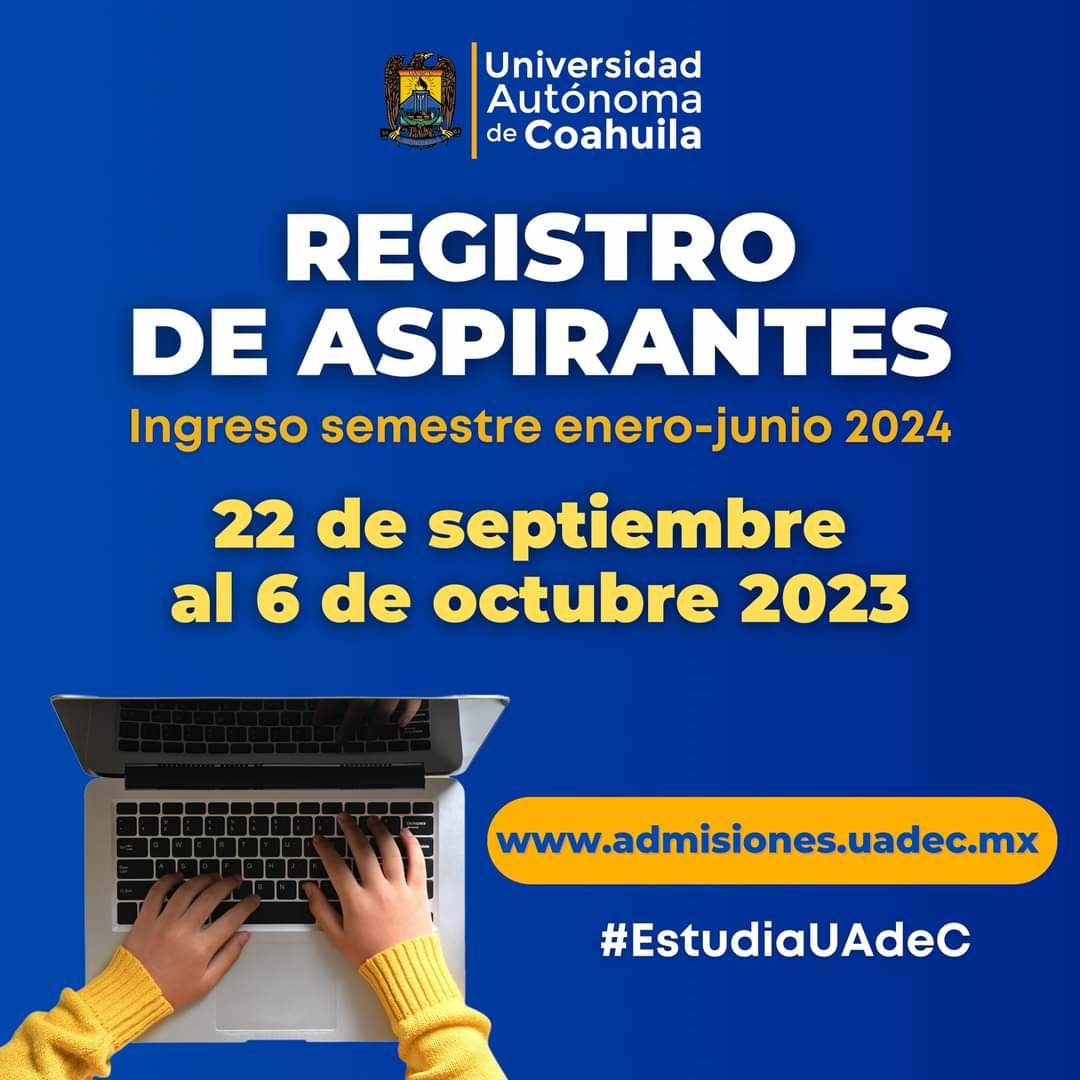 SALTILLO, Coahuila. 21 de septiembre de 2023. Del 22 de septiembre al 6 de octubre de 2023, la Universidad Autónoma de Coahuila abre el registro para aspirantes de Bachillerato y Licenciatura que deseen ingresar a la máxima casa de estudios para el semestre enero-junio 2024, el proceso es por medio del portal web de Admisiones www.admisiones.uadec.mx.