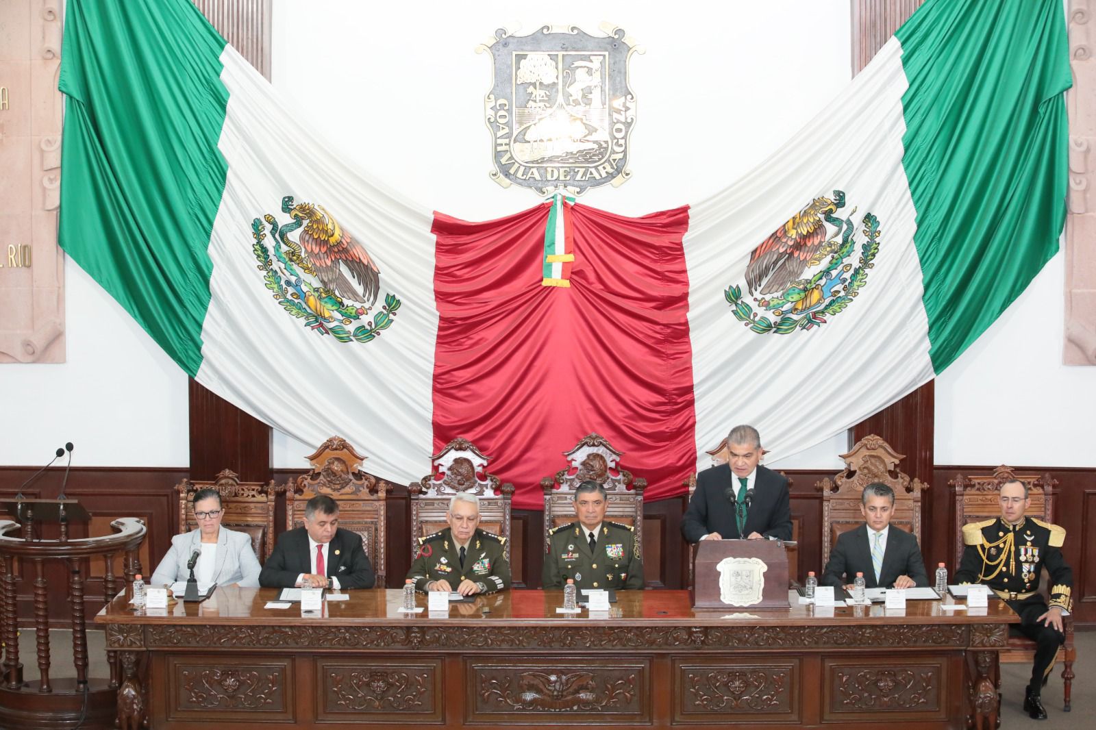 Ante la presencia del General Ricardo Trevilla Trejo, Jefe del Estado Mayor Conjunto de la Defensa Nacional, y del General Jorge Antonio Maldonado Guevara, Director del Heroico Colegio Militar, así como de diputadas y diputados en funciones y electos, el Gobernador de Coahuila agradeció y reconoció al titular de la SEDENA por su contribución fundamental para hacer de Coahuila un estado más fuerte, con seguridad, de progreso y estabilidad social.