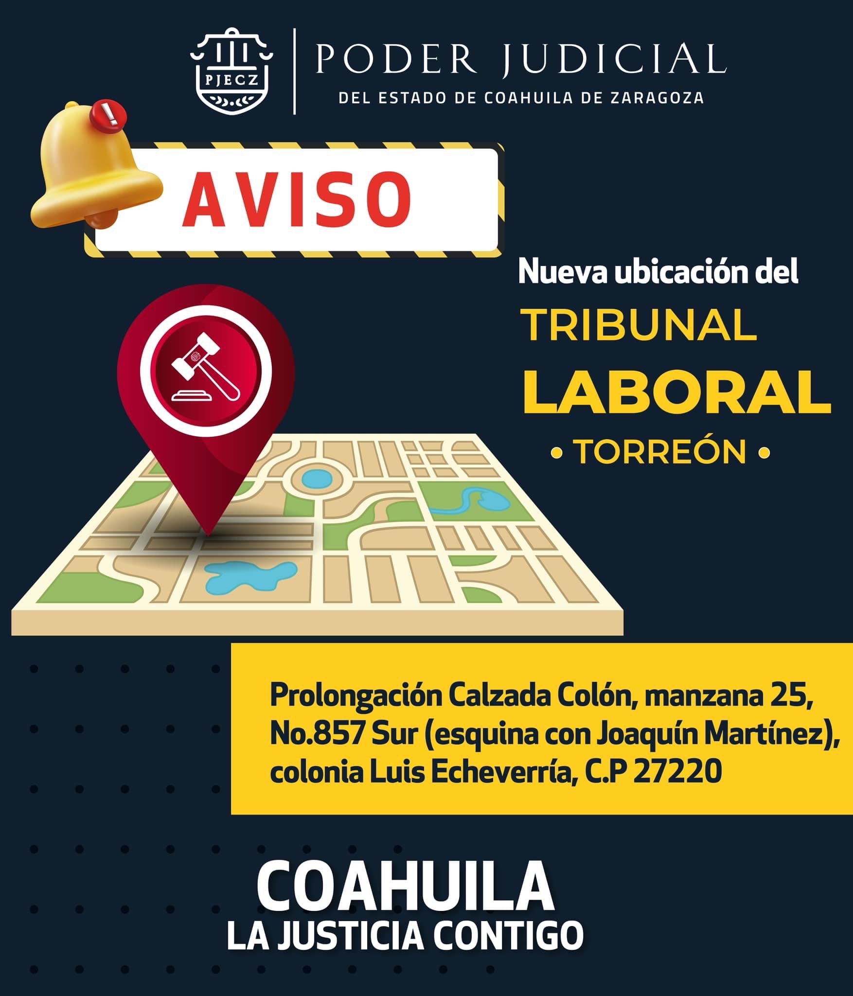 El Tribunal Laboral del Distrito Judicial de Torre贸n, cambia de sede. 隆Con贸cela! 馃搷Prolongaci贸n Calzada Col贸n, manzana 25, No. 857 Sur esquina con Joaqu铆n Mart铆nez, Colonia Luis Echeverr铆a C.P 27220, Torre贸n, Coahuila.