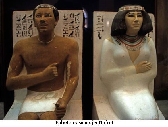 - Rahotep y su mujer Nofret. V dinastía. Piedra calcaria pintada. La conservación es total: colores fuertes y firmes. Los rostros son retratos. Impresionante.