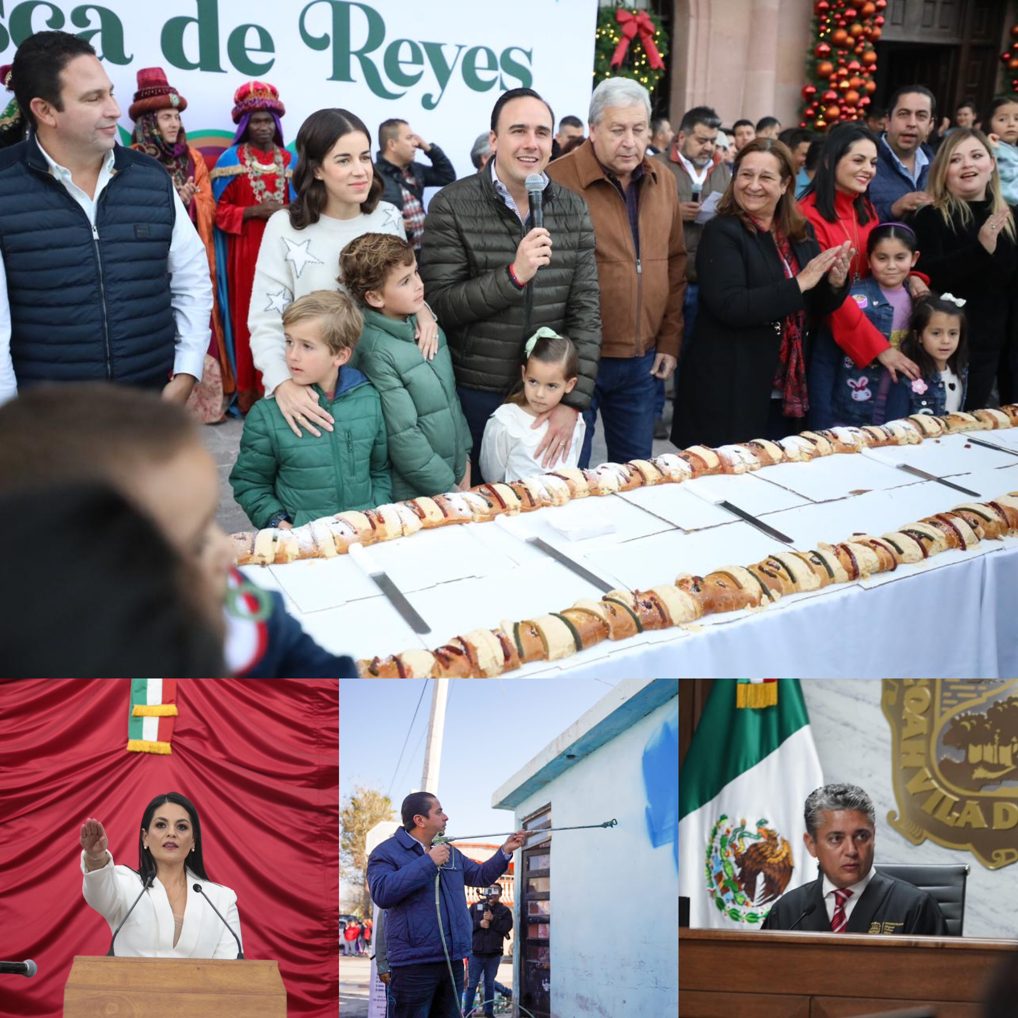 Teniendo como escenario Villamagia Saltillo, el gobernador Manolo Jiménez Salinas y su esposa Paola Rodríguez López, presidenta honoraria de Inspira Coahuila, compartieron la tradicional Rosca de Reyes con cientos de familias que se dieron cita en la plaza de armas de la capital del estado.