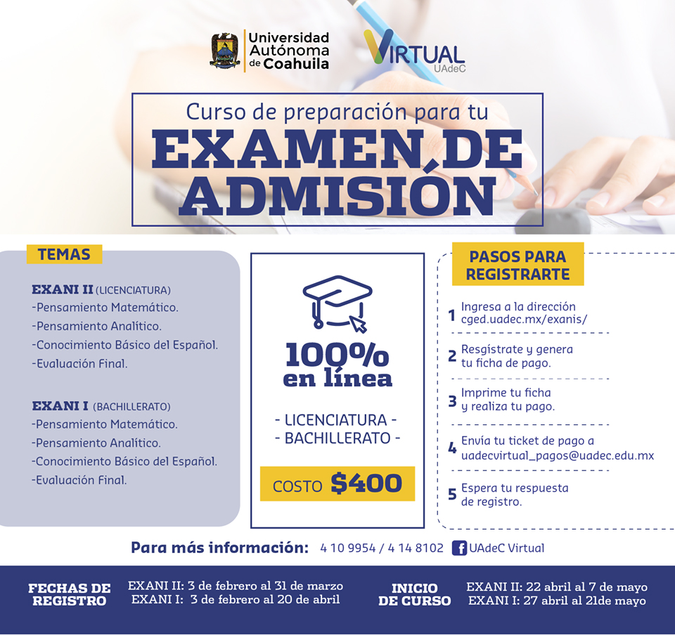 Para más información, comunicarse a la Coordinación General de Educación a Distancia a los teléfonos (844) 4 14 78 58, 4 14 81 02 o 4 10 99 54 o visitar la página www.cged.uadec.mx/exanis .
