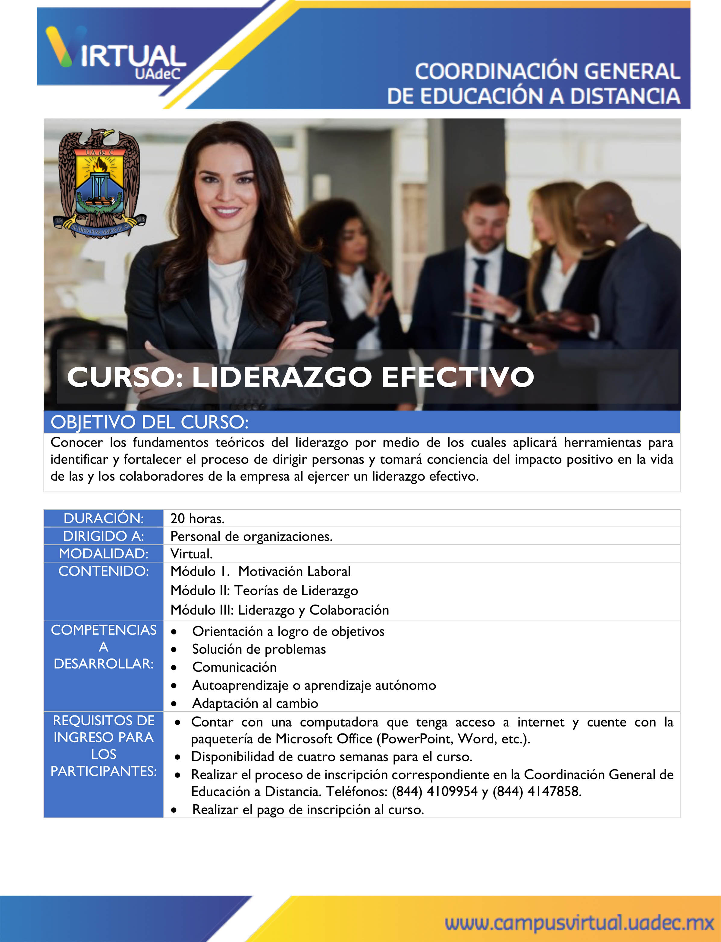 SALTILLO, Coahuila; 20 de marzo de 2020.- La Universidad Autónoma de Coahuila, en conjunto con la Coordinación General de Educación a Distancia, invita a los talleres "Liderazgo efectico" y "Comunicación asertiva" que se cursarán en la modalidad virtual para todo aquel que deseen participar y adquirir nuevos conocimientos.