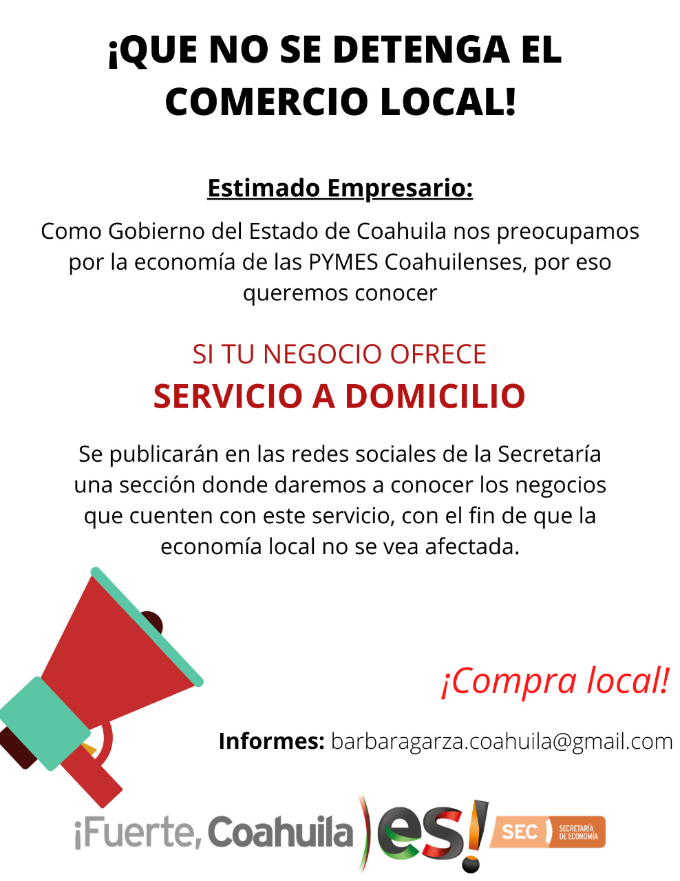 Jaime Guerra Pérez, Secretario de Economía de Coahuila, manifestó que como apoyo a las micro, pequeñas y medianas empresas se tiene la medida de publicar en las redes sociales de la SEC información de negocios locales con el único requisito que cuenten con servicio a domicilio.