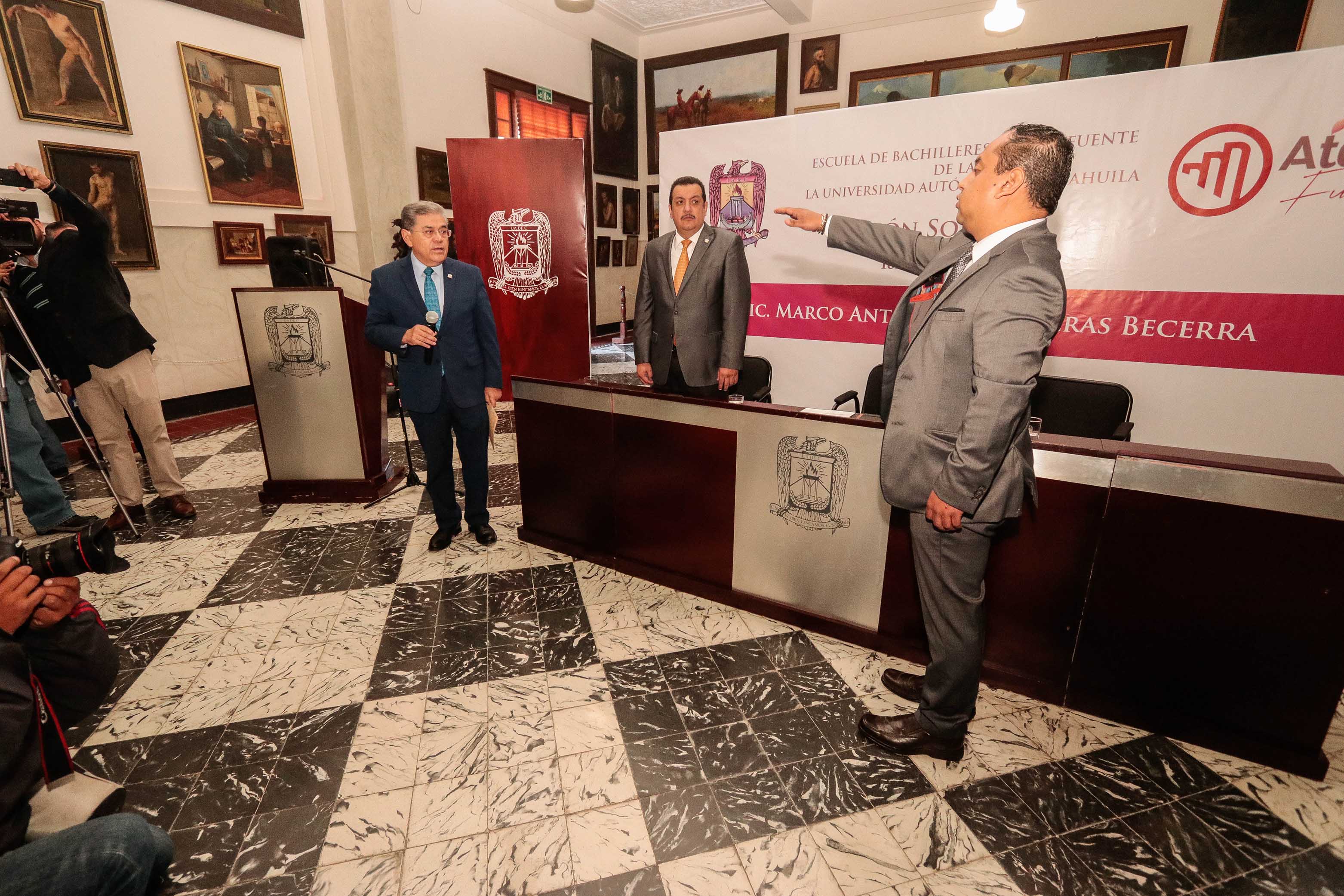 SALTILLO, Coahuila; 14 de noviembre de 2019.- El rector de la Universidad Autónoma de Coahuila, Salvador Hernández Vélez, tomó protesta a Marco Antonio Contreras Becerra como director de la Escuela de Bachilleres Ateneo Fuente para el periodo 2019-2022.